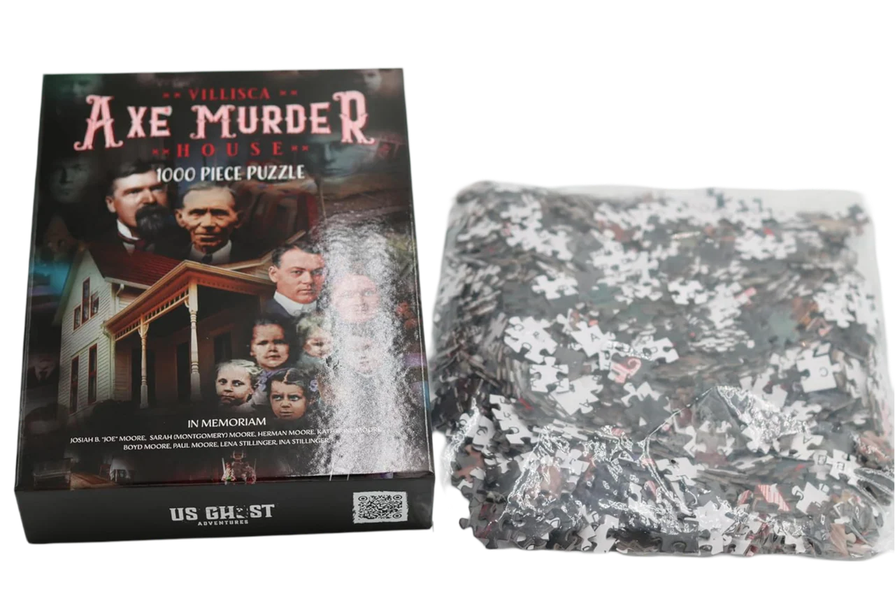 Immerse yourself in a captivating challenge with the Villisca Axe Murder House 1000 Jigsaw Pieces Puzzle. This intricately designed puzzle features a hauntingly detailed image of the infamous Villisca Axe Murder House and the historical figures, providing hours of engaging entertainment. Perfect for puzzle enthusiasts, true crime fans, and history buffs, this puzzle combines the thrill of solving with the intrigue of one of America's most notorious unsolved crimes.